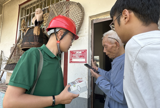 在检查途中,一耄耋老人向他们发起求助。实践队员仔细询问后,发现是充电费后,家中久久未恢复供电。在闷热的房间里,没有风扇和空调,老人难免有些着急。师傅听后立马为老人排查故障,检查电表后发现是其充错了费用所致。老人情绪激动起来,“我的钱啊!这可怎么办呐,哎呦,哎呦……”。师傅见状并没有立马带着实践队员们离开,前往下一户继续开展电表检查工作,而是耐心地操着老人能听懂的方言,用易懂的话来为老人讲解退费流程。实践队员们一边安抚老人,一边协助师傅教老人操作。最后,老人按流程顺利完成退费操作,这才放下心来并连连向实践队员们道谢:“这么热的天,你们真是帮了我大忙了!”