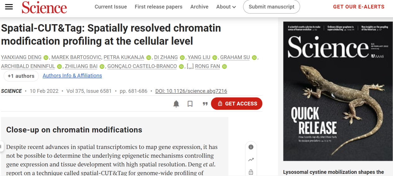 近日,2010届校友邓彦翔博士以第一作者在《Science》上发表了一篇研究论文,题为“Spatial-CUT&Tag: Spatially resolved chromatin modification profiling at the cellular level”他们开发了一种空间分辨的表观遗传分析新技术,首次实现了在空间和全基因组水平上观察组织发育的表观遗传机制,以及对发育和疾病相关的表观遗传调控的空间映射,有望开辟全新治疗途径。该研究由耶鲁大学生物医学工程系教授、耶鲁大学医学院病理学教授樊荣领导,与瑞典斯德哥尔摩卡罗林斯卡学院的研究人员合作完成的。
