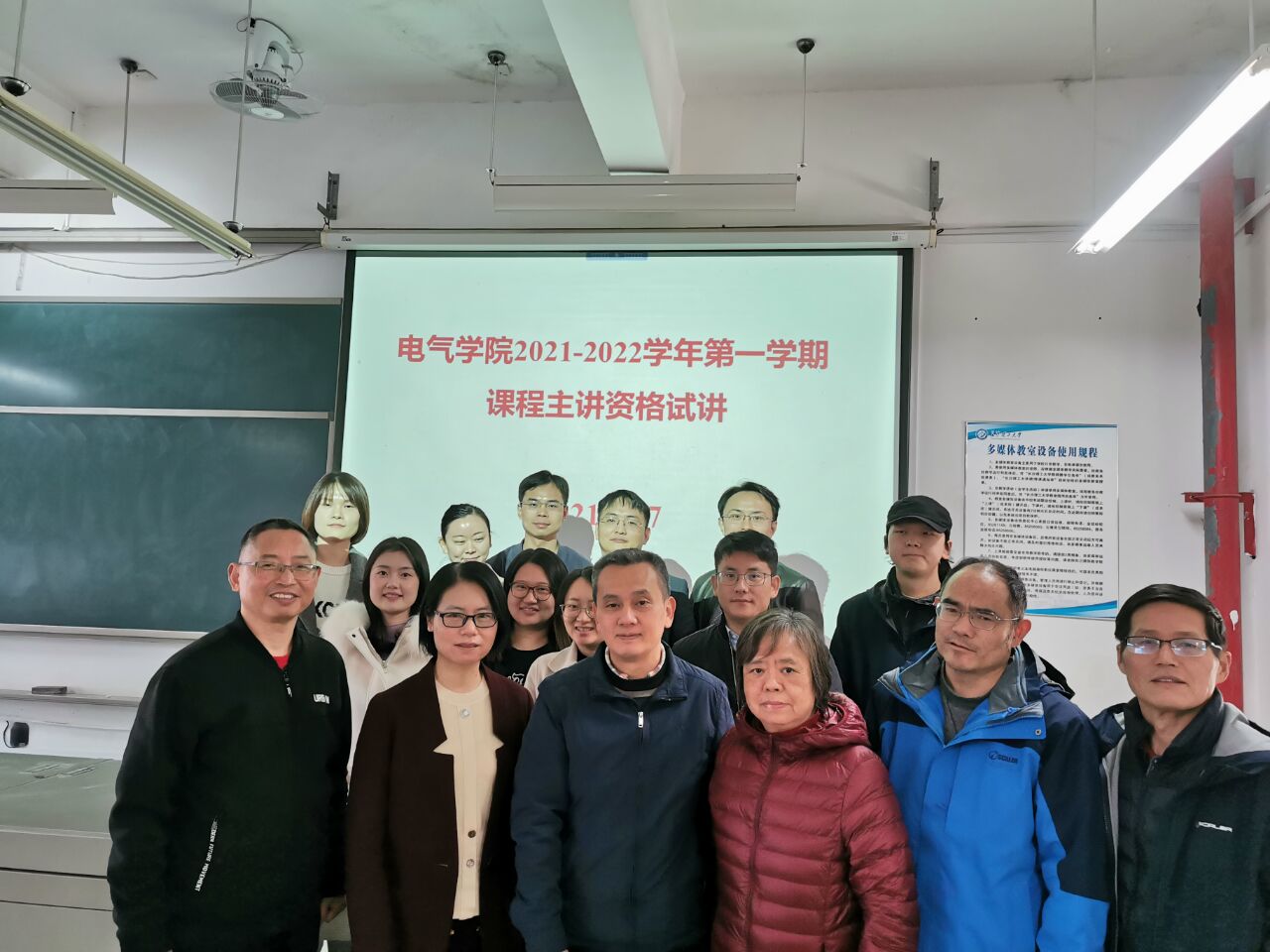 试讲按照学校“关于做好2021-2022学年第一学期(第二次)教师课程主讲资格申报和试讲工作的通知”要求进行,先后由黄婧杰、(试讲课程《电力系统暂态分析》)、颜勤(试讲课程《电力系统稳态分析》)、项胜(试讲课程《电工电子技术A(上)》)、李清辉(试讲课程《电磁场》)、吴公平(试讲课程《电机学》)、时一斐(试讲课程《数字电子技术A》)、李灵(试讲课程《信号与系统》)、施星宇(试讲课程《发电厂电气部分》)、伍万能(试讲课程《计算机控制技术》)何叶(试讲课程《自动控制原理》)上台试讲。