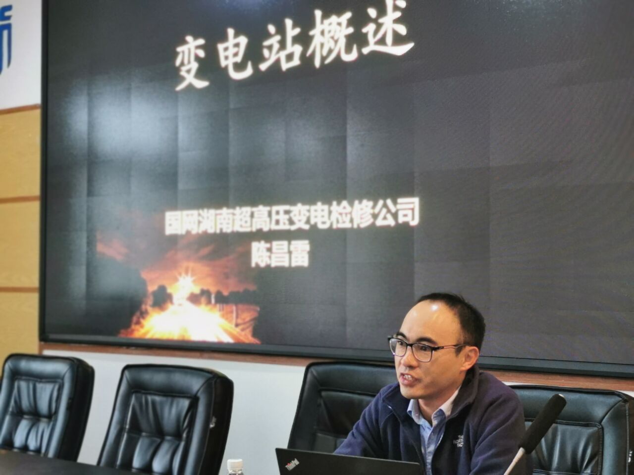 陈昌雷向师生们系统介绍大型智慧变电站在电网中的作用,介绍变电站内一次设备、保护及自动装置、辅助设备配置情况,讲述设备作用及相互联系,简述维护重点。