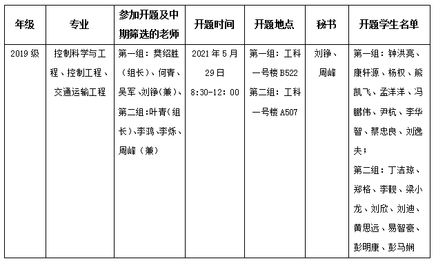 控制科学与工程、控制工程学科一组和交通运输工程组开题及中期筛选考核安排已公示,请大家提前填写好《开云kaiyun体育研究生论文开题报告表》与《研究生中期筛选考核评定表》,做好答辩准备。