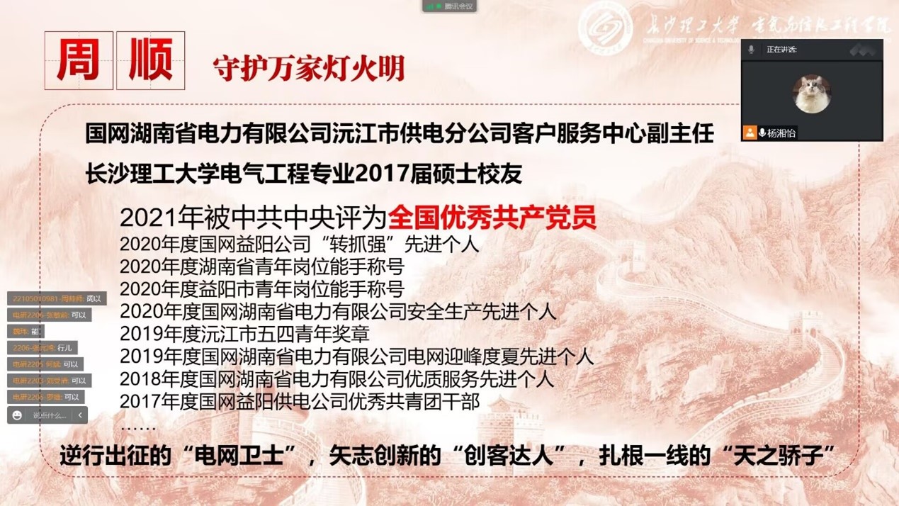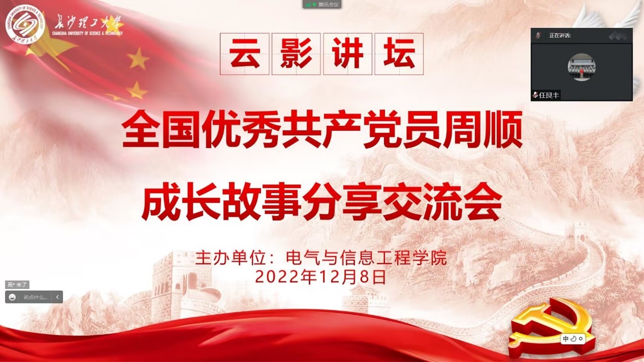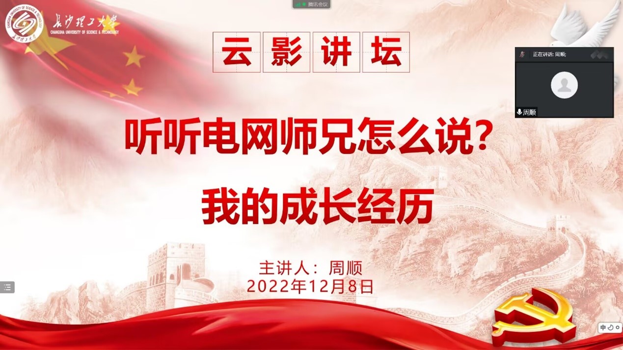 12月8日上午,电气学院开展云影讲坛系列专题讲座,邀请全国优秀共产党员、开云官网2017届优秀硕士校友周顺主讲,电气学院党委副书记任艮丰、研究生辅导员杨湘怡出席,全体2022级硕博研究生参加。