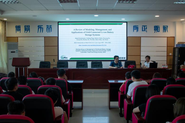 报告最后,教师代表陈众与王才胜教授进行了更深入的交流和讨论,聚焦于锂电池储能系统在电动汽车领域的应用,双方就电动汽车充电桩群功率调控方面存在的问题展开了激烈而富有建设性的对话。本次讲座为与会者提供了一个宝贵的学术交流平台,加深了同学们对锂电池储能系统的管理和应用的认识,拓宽了同学们的视野。