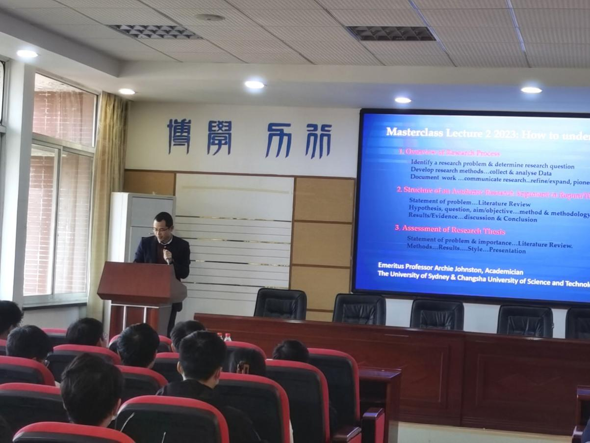 11月23日下午,澳大利亚科学技术与工程院院士、开云kaiyun体育湖湘学者特聘教授Archie James Johnston在工一B503学术报告厅为学院师生做《How to undertake research》主旨报告。报告会由学院副院长王文主持,学院教师代表、研究生近100人参加。