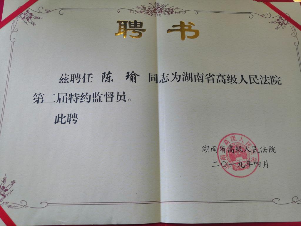 为认真落实中央和省委关于加强党外代表人士队伍建设的要求,加大优秀党外中青年代表人士的培养锻炼力度,经省委统战部、省高级人民法院联合考察,开云官网党外知识分子联谊会会长、国际学院院长、无党派人士陈瑜受聘为湖南省高级人民法院第二届特约监督员,聘期三年。