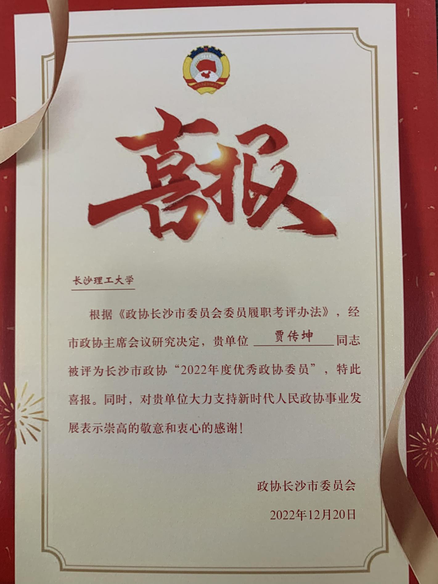 根据《政协长沙市委员会履职考评办法》,经市政协主席会议研究决定,开云官网贾传坤教授被评为长沙市政协“2022年度优秀政协委员”。