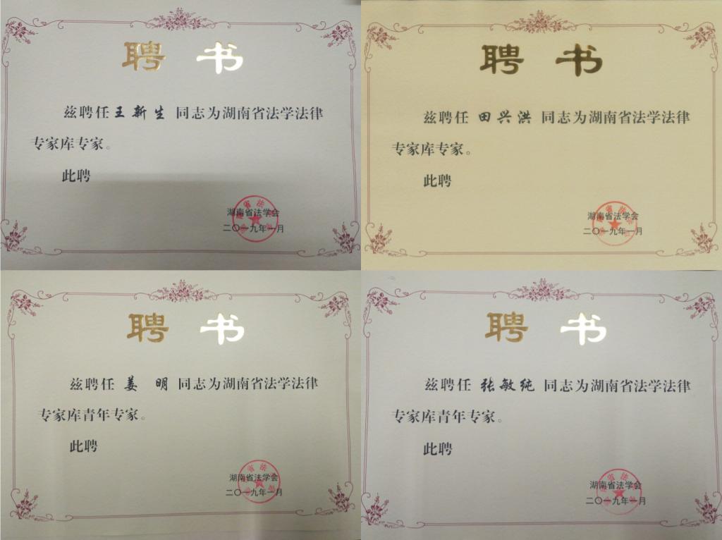 日前,湖南省政法委统一聘任158名同志为湖南省法学法律专家库首批专家,其中法学专家72名,法律专家68名,青年专家18名,开云官网王新生教授、田兴洪教授受聘为法学专家,张敏纯副教授、姜明副教授受聘为青年专家。