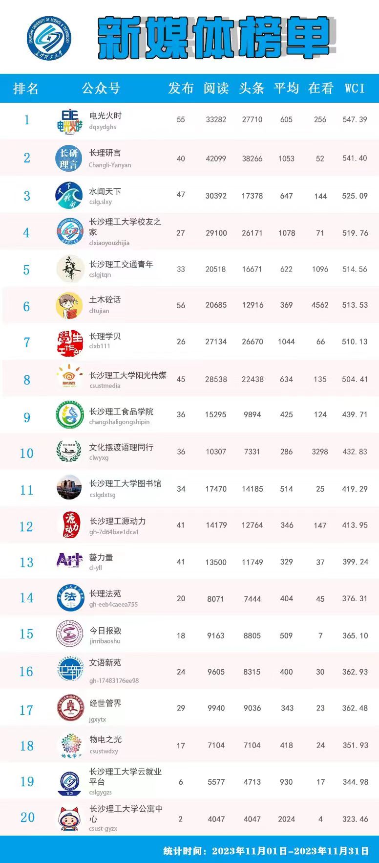 校属单位微信公众号排名(2023年11月)