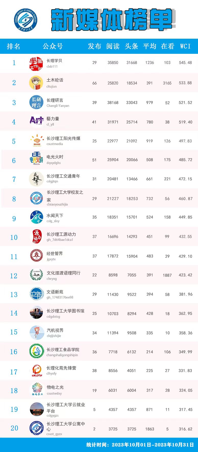 校属单位微信公众号排名(2023年10月)