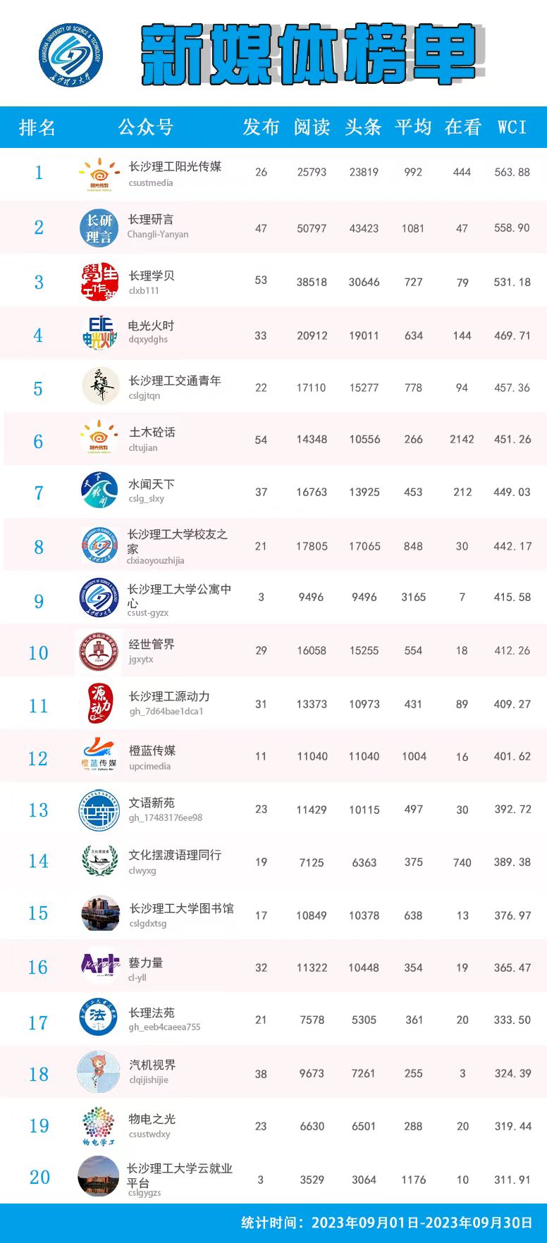 校属单位微信公众号排名(2023年9月)