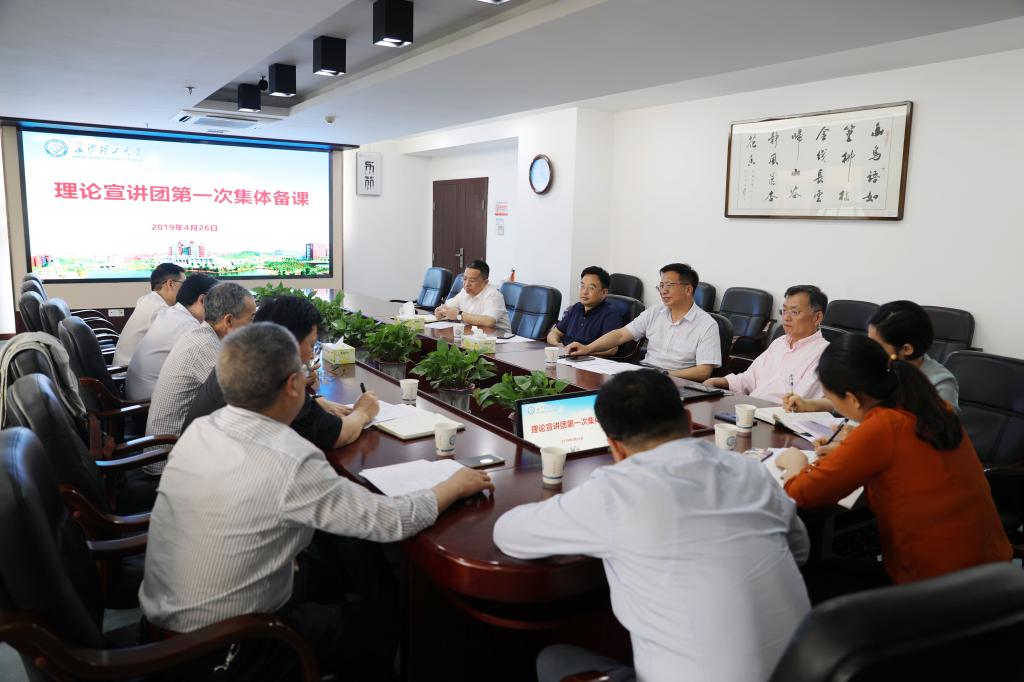 为进一步学懂弄通做实习近平新时代中国特色社会主义思想,强化理论武装,4月26日下午,党委宣传部在一办六楼会议室组织召开理论宣讲团第一次备课,党委书记付宏渊,部分校领导,学校理论专家,马克思主义学院老师参加,会议由党委宣传部部长方琼主持。