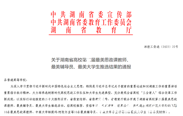 长期以来,学校坚持以习近平新时代中国特色社会主义思想为指导,深入贯彻落实习近平总书记关于教育的重要论述和对湖南工作的重要讲话重要指示批示精神,全面贯彻党的教育方针,扎实开展思想政治工作和“三全育人”综合改革工作,切实推进思政工作队伍建设,积极培育师生先进典型,努力培养“底色亮、实践强、有情怀、敢担当”的时代新人。广大师生要深入学习贯彻落实党的二十大精神,落实“三高四新”战略定位和使命任务,积极向先进典型学习,以更加饱满的热情、更加昂扬的斗志、更加务实的作风,为决胜建成“百强”大学贡献力量。