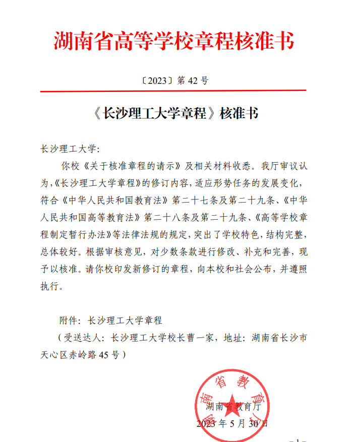 近日,湖南省教育厅以湖南省高等学校章程核准书(〔2023〕第42号),核准通过了开云官网新修订的《开云kaiyun体育章程》。