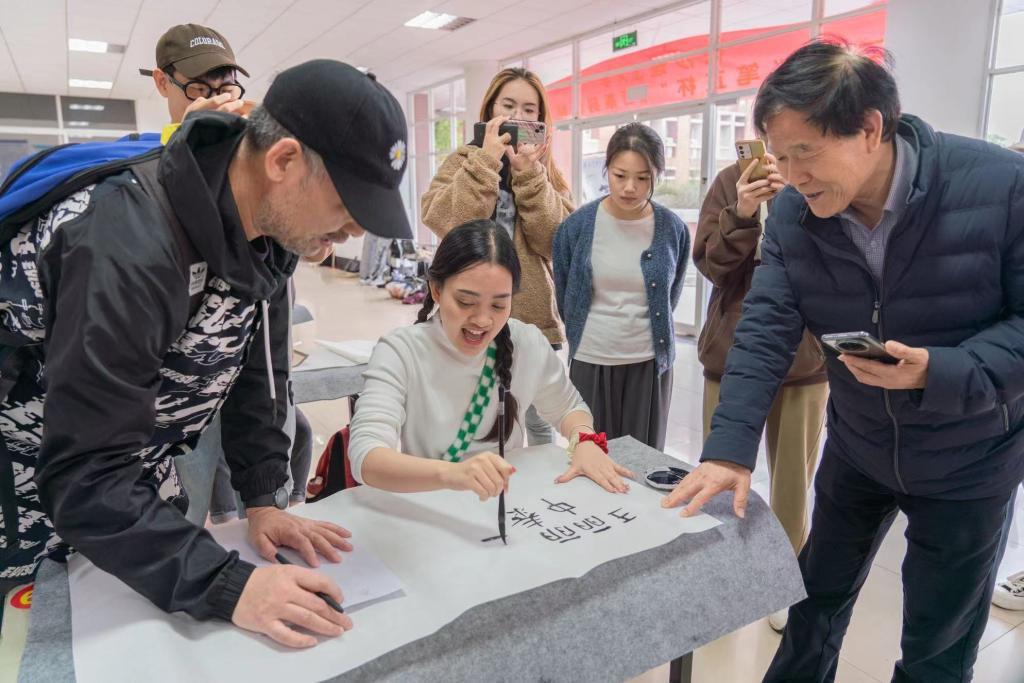 来自泰国的王丽丽同学熟练运用毛笔,对中国汉字书写一点就通,在老师们指导下,写下“中泰友好一家亲”的和平祝语。老师们向王丽丽解释这美好祝语背后所蕴含的中国一直奉行的人类命运共同体理念。