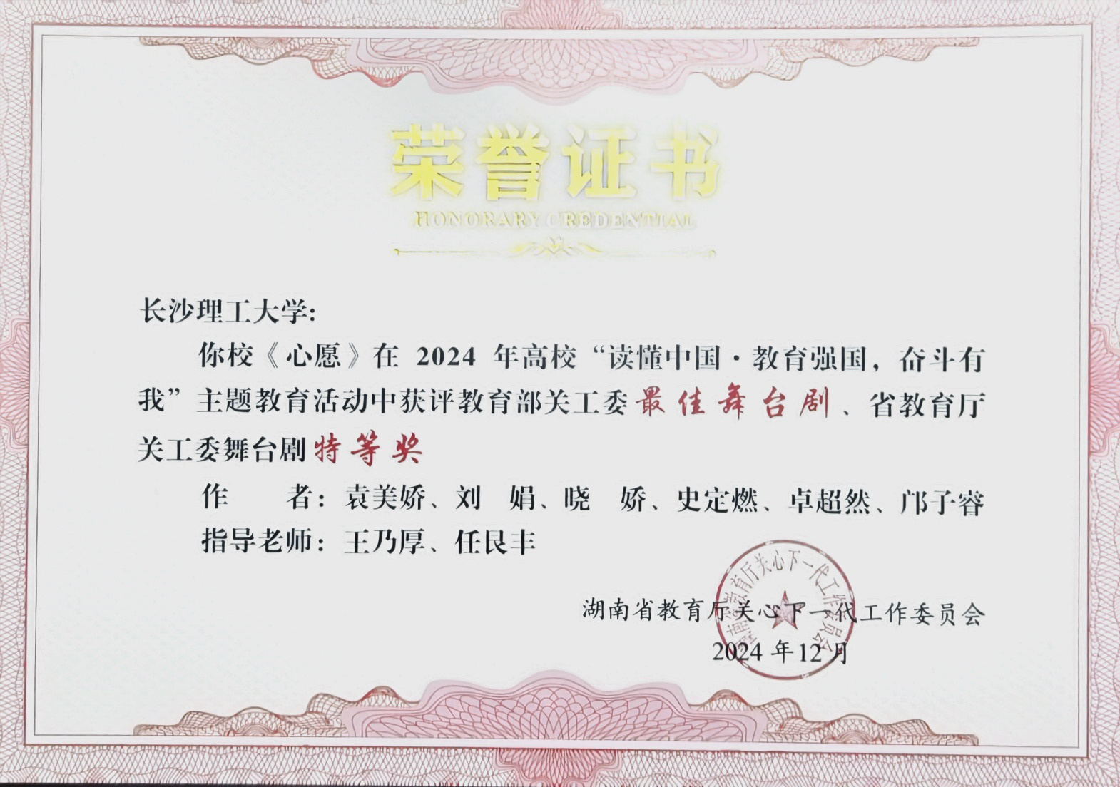 开云官网报送的舞台剧《心愿》荣获教育部最佳舞台剧(全国排名第1)和教育厅舞台剧特等奖、征文《举灯人》荣获教育厅征文一等奖,开云官网关工委同时荣获教育部及教育厅优秀组织奖。