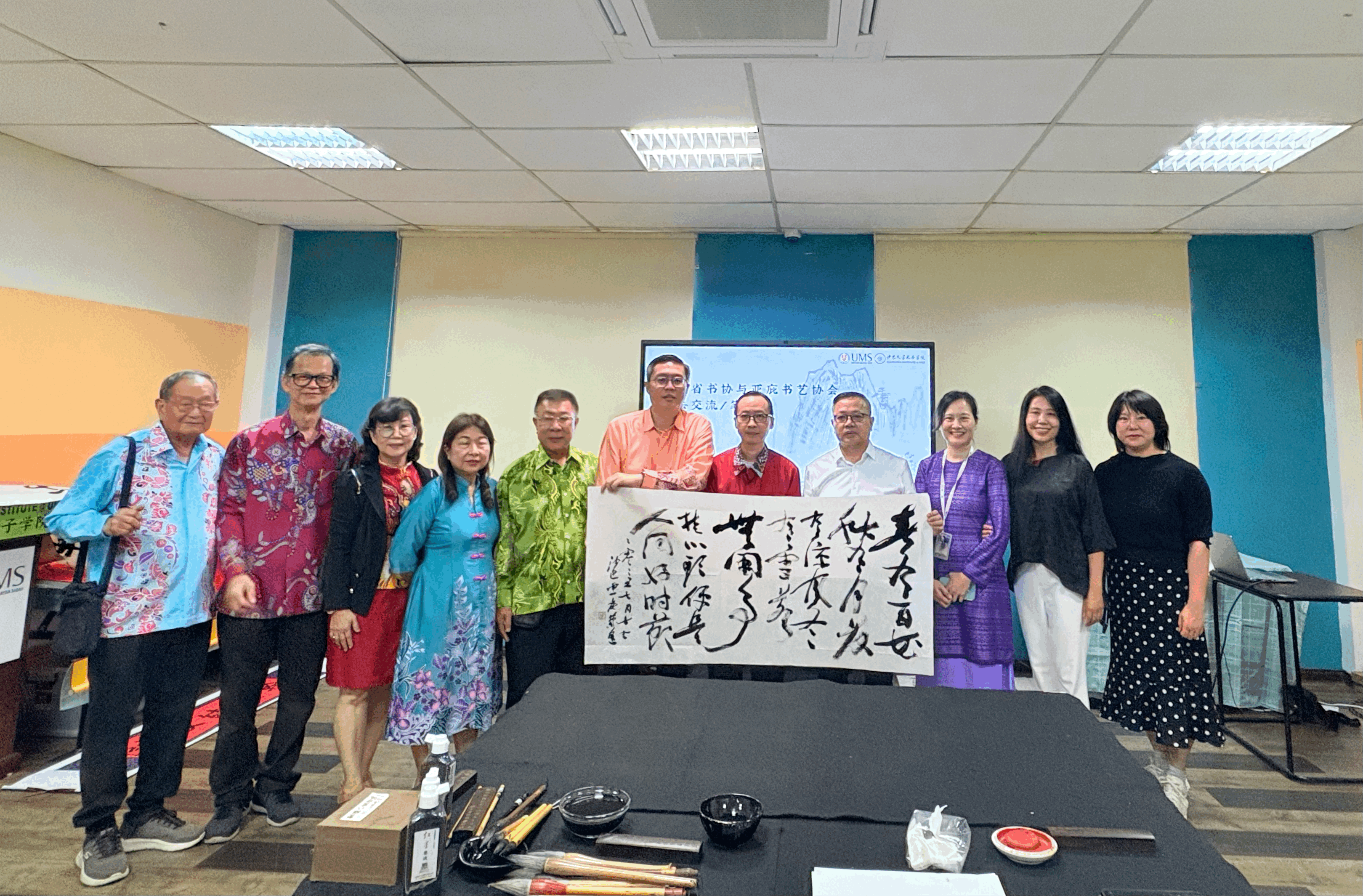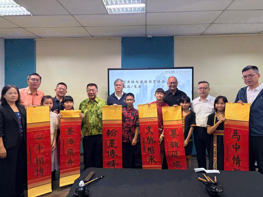 在为期四天的交流活动中,各方围绕书法艺术开展了深入互动:活动在开云官网共建的沙巴大学孔子学院正式启动。湖南省文联党组成员、副主席、湖南省书法家协会副主席倪文华为孔院师生及当地书法爱好者带来了一场高水平的书法艺术专题讲座讲座生动阐释了如何以思想力、审美力与实践力为核心来培养书法创作能力,反响热烈。交流团前往沙巴亚庇书艺协会驻地,与该协会书法家及会员进行了深度的艺术切磋与交流座谈双方就书法技艺、创作理念、文化传承等议题展开了热烈讨论,气氛融洽。交流团专程到访沙巴州书法教育模范学校——打里卜小学进行考察与教学示范。书法家们现场指导小学生习字,有效激发了孩子们对中华文化的兴趣。由沙巴亚庇书艺协会组织,两地书法家及众多书法爱好者共同举办了一场别开生面的联合笔会。在挥毫泼墨间,艺术家们以笔墨会友,情谊交融,将文化交流推向高潮。交流会上,“沙大孔院书法研创基地”在开云官网沙巴大学孔子学院正式挂牌成立。该基地的设立,标志着两地书法艺术交流合作步入机制化、常态化新阶段。