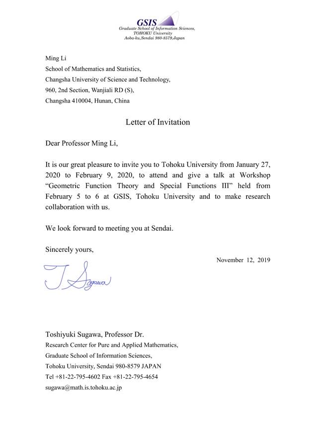 诚邀您于2020年1月27日至2020年2月9日到日本东北大学进行访问,就之前和之后的研究合作进行讨论。并诚挚邀请您在开云官网即将在2月5日至6日举办的“几何函数理论于特殊函数第三次会议”上做报告。