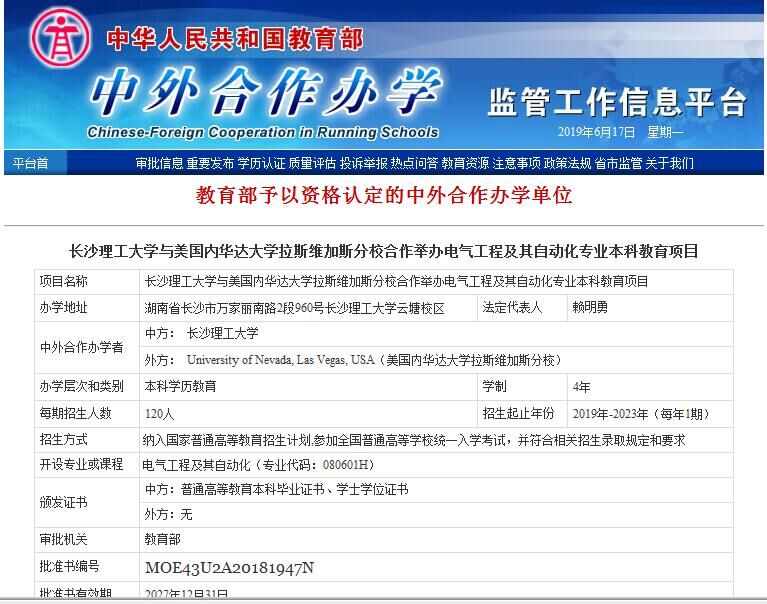 开云kaiyun体育与美国内华达大学拉斯维加斯分校合作举办电气工程及其自动化专业本科教育项目于2018年获得教育部批准(编号:MOE43U2A20181947N),融合两校强势专业“电气工程”之优势,严格遵守《中外合作办学条例》和《中外合作办学条例实施办法》办学,紧密依托国际化、专业化的高水平管理团队运行。该项目融合中美双方优质教育资源,精心打造人才培养方案,其中1/3以上核心课程采用美方原版教材、师资、教学方式等优质教育资源,培养兼具国际化视野与家国情怀、拥有创新精神和跨文化交际能力、系统掌握电气工程专业基础理论知识和现代工程技术、具备良好科学素养与工程实践能力的应用型高级专门人才。