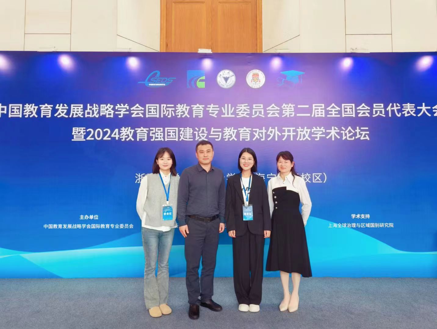 为深入贯彻党的二十大精神,坚定推进高水平教育对外开放,不断增强我国教育国际影响力,中国教育发展战略学会国际教育专业委员会于2024年4月12-14日在浙江大学国际联合学院(海宁国际校区)召开了“中国教育发展战略学会国际教育专业委员会第二次会员代表大会暨2024教育强国建设与教育对外开放学术论坛”。本次会议由中国教育发展战略学会国际教育专业委员会主办,浙江大学、澳门大学、江苏子信科技创新研究院有限公司承办,上海全球治理与区域国别研究院提供学术支持。教育部国际合作与交流司、中国教育发展战略学会、海宁市政府以及来自浙江大学、北京大学、清华大学、北京师范大学、兰州大学等高等院校及有关机构的相关领导和专家参加了此次活动,我院4名教师代表应邀参加。