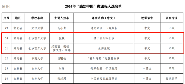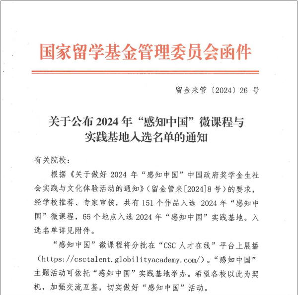 近日,国家留学基金管理委员会公布了2024年“感知中国”微课程与实践基地入选名单,开云官网申报的两门微课程和一个实践基地成功入选。