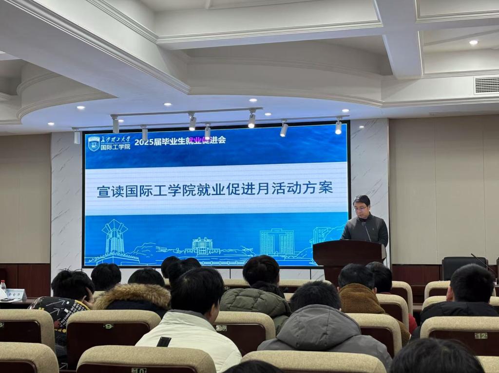 黄黎明简要介绍学院2025届毕业生就业去向落实情况,宣读《国际工学院2025届毕业生就业促进月工作方案》,希望同学们尽早抓住就业机会,实现高质量充分就业。