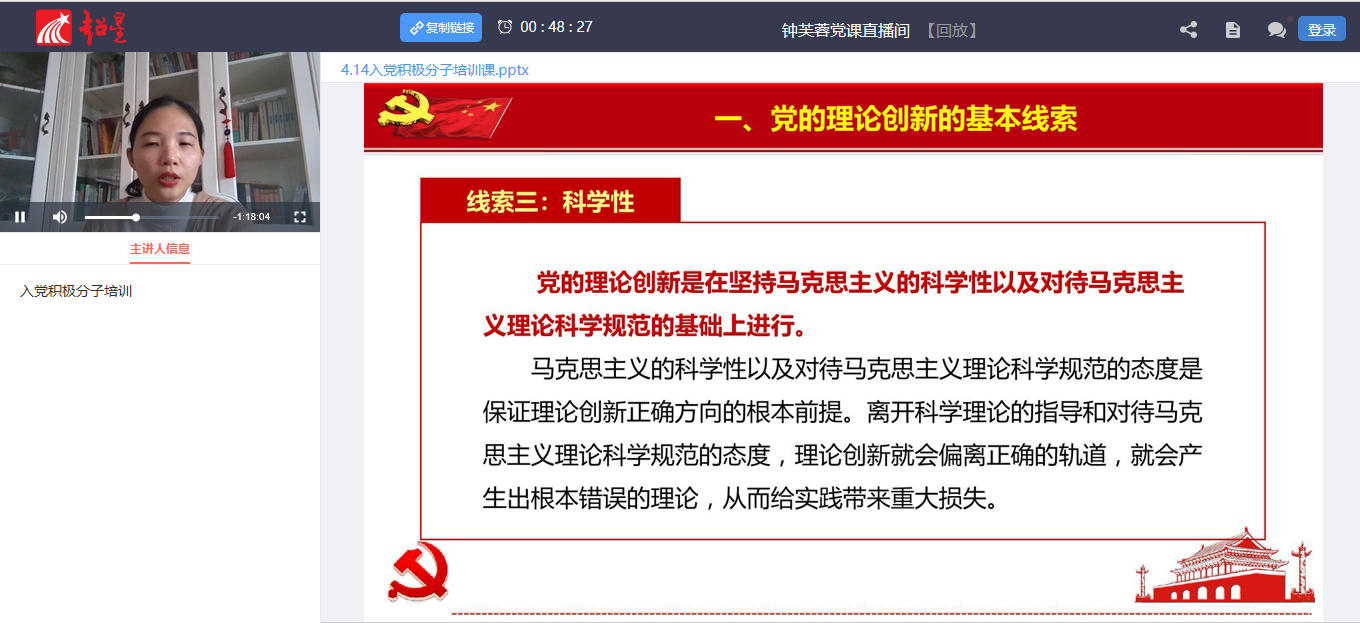 随后,马克思主义学院钟芙蓉老师通过超星学习通直播的方式,为入党积极分子进行了授课,授课主题为《与时俱进---不断推进实践基础上的党的理论创新》。钟老师从党的理论创新的基本线索、党的理论创新的实践本质、党的理论创新的基本经验三个方面,向学员进行详细讲述。课程内容丰富、授课方式生动活泼,深受学员喜爱。课后,接受培训的学员纷纷表示收获很大,意犹未尽,加深了他们对党的理论的认识和理解。