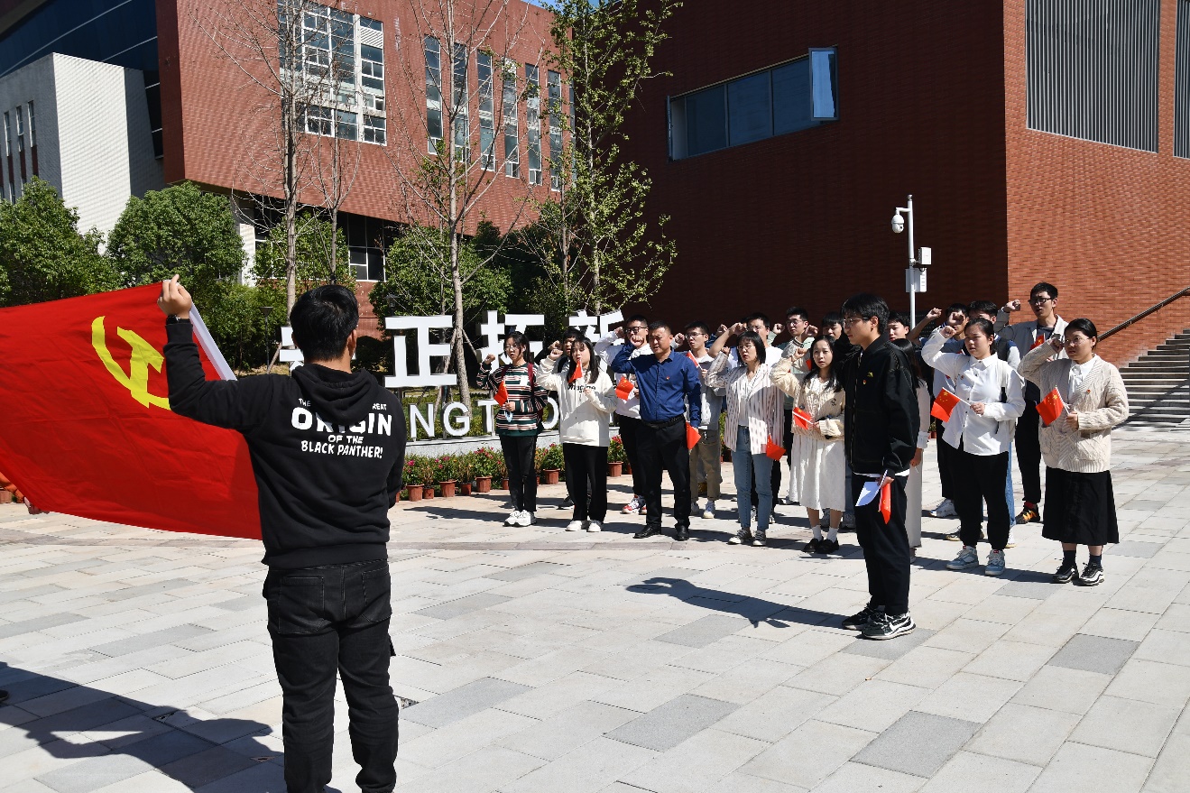 参观前,学生党员面对党旗重温入党誓词,铿锵有力的誓词回荡在教育基地前,展现了学生党员们无私奉献的决心,党员们又回到了怀着崇敬激动的心情佩戴上神圣党徽的那一天,又回忆起自己入党的初心。