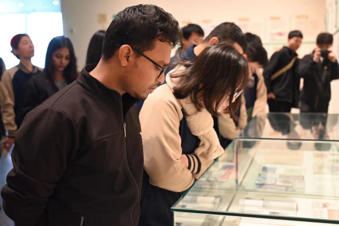 师生集中观看了“中国精神”主题视频,感悟伟大革命精神魄力。在“峥嵘印记”——红色经典全国版画作品展、“源·流——湖南工笔画70年”主题展的艺术作品中体会中国共产党艰苦卓绝的峥嵘岁月,在以八一南昌起义、秋收起义、井冈山革命根据地创建等红色经典为题材的艺术呈现中体会中国共产党精神谱系的感人力量,来华留学生们也感受到了湖湘文化的丰富多彩。