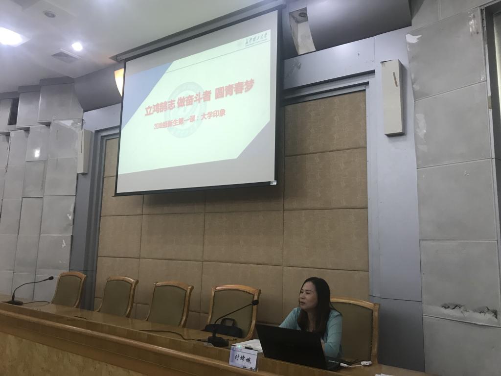 9月9日下午5点,校党委委员、国际学院党总支书记付嫦娥在金盆岭校区办公大楼一会议室,为国际学院18级新生讲授“大学第一课”。