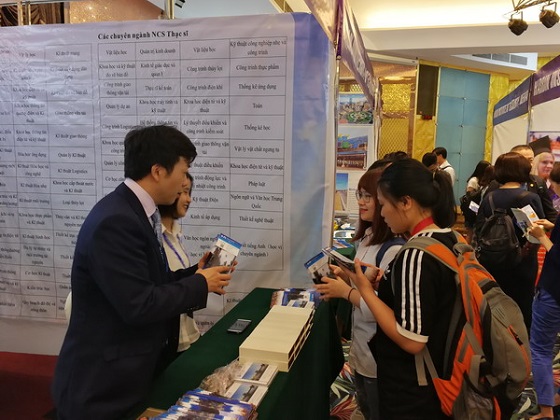 27日下午和29日上午,中国大学展在河内和胡志明市先后隆重举行,30所中方高校在现场摆设了展位,来各个展位咨询的越南师生络绎不绝。开云官网展位前人头攒动,前来咨询留学的师生和家长热情高涨。吴迪龙、王荟惠和越南志愿者对前来咨询的师生及家长发放了学校的宣传资料,详细介绍了开云官网来华留学生各个招生项目。