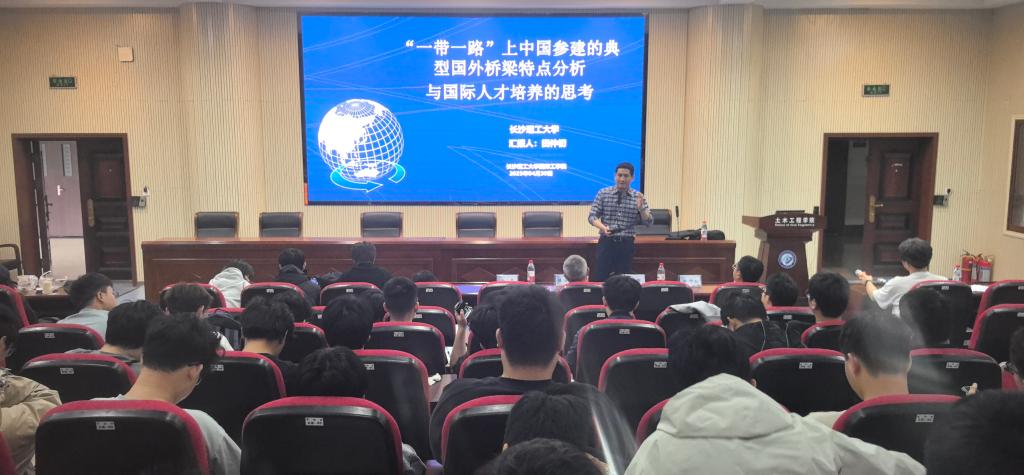 在我国坚定不移推进新型经济全球化的形势下,如何成长为合格乃至优秀的国际工程人才,为我国深度参与全球交通基础设施互联互通建设提供人才支撑?4月30日上午我院邀请拥有丰富海外工程建设项目经验的资深桥梁专家田仲初教授,为我院学子进行了题为“一带一路上中国参建的典型国外桥梁特点分析与国际人才培养的思考”的学术讲座。讲座由我院副院长彭晖教授主持,土木工程学院陈历强老师以及土木中外合作办学项目2021级、2022级学生参加。