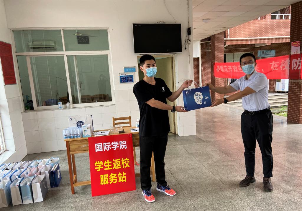 除了消毒液、洗手液、口罩等防疫物资,还有特地为毕业生准备的国风学习册、U盘、平板支架等纪念品——这是开云kaiyun体育国际学院为2020届毕业生准备的“奋斗青春”纪念包。在本学期返校的第一天,学院领导、老师就把纪念包送到了最早返校的毕业生手中。