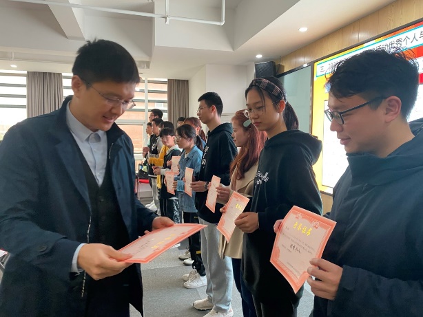 颁奖仪式中,学院领导、老师为获评优秀的集体和个人颁发荣誉证书。