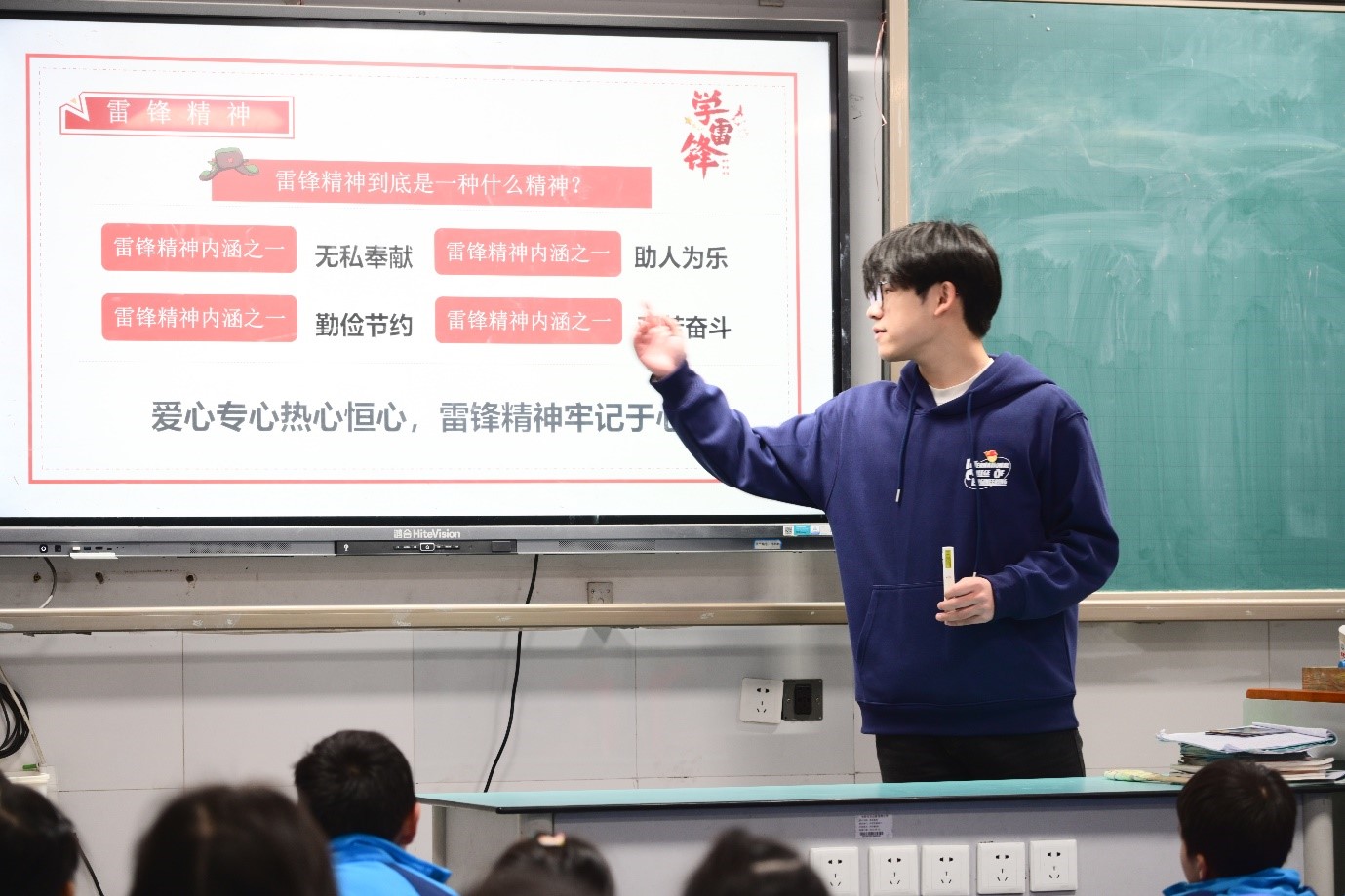 学生党员侯涵斌变身“安全小老师”,借助动画短片传授校园、交通、消防及防溺水等安全知识,通过趣味问答和情景模拟,为孩子们带来沉浸式安全教育。学生党员们主动承担起了“护学岗”的职责,在校门口亲自护送小学生们安全离校,传递社会温暖,彰显雷锋精神的实践力量,争当新时代的活雷锋。