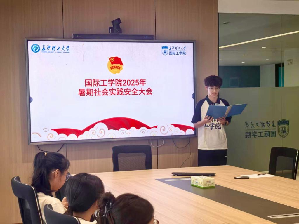 首先李佳豪对暑期社会实践的开展进行介绍,本次赴国网团队共计22人,将到达天津、新化、永州、沅江、长沙等多地开展实践活动。接下来详细开展了本次“三下乡”社会实践的安全宣讲,强调了实践过程中的电力设施操作规范、防暑措施以及团队纪律意识。最后,黄黎明进行总结讲话,对参与本次暑期“三下乡”社会实践活动的全体成员提出要求,进一步强调了安全问题的重要性,严格遵守各项安全规程和团队纪律,他殷切期望同学们珍惜实践机会,深入基层,锤炼本领,以实际行动展现国际工学院学子的良好风貌。
