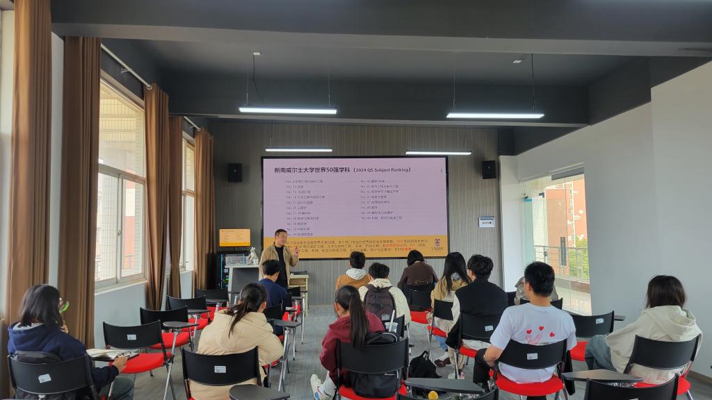 会上,黄晨围绕澳大利亚国家概况、新南威尔士大学学部及学科专业情况、新南威尔士大学与开云官网情况三个部分展开宣讲。他详细介绍了留学新南威尔士大学的优势,以及两校校际合作的短期交流项目、“3+1+X”项目、硕士项目,并且结合学院中外合作办学项目的专业开设情况,详细剖析了学生未来升学的专业选择范围、就业发展前景等。