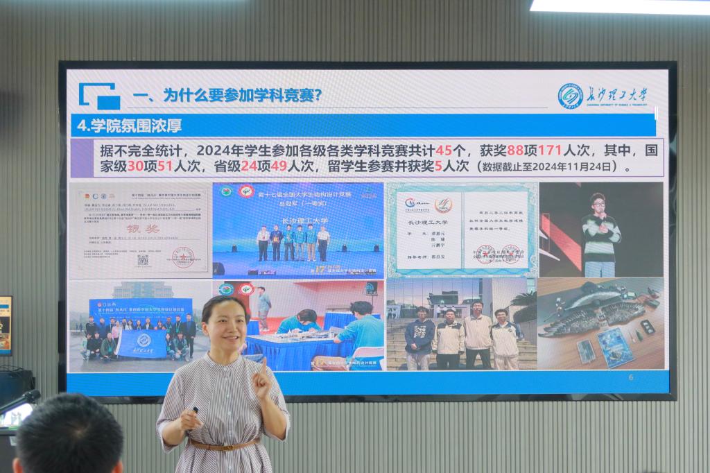 会上,黄文卫以《国际工学院大学生学科竞赛“三问”》为题,围绕什么是学科竞赛、为什么要参加学科竞赛、以及如何参加学科竞赛三个方面展开细致讲解。她主要介绍了适合中外合作办学项目学生参加的主要赛事,梳理了综合类竞赛与专业基础竞赛之间的逻辑,展示了学院近年典型的项目案例及其培育过程,总结分析了近两年综合类竞赛学院选拔赛上暴露出的主要问题她告诉同学们学科竞赛是深化专业学习的重要抓手,能够帮助其增强科研创新意识,开拓课外学术视野、提高工程实践能力、提升个人综合素质。她鼓励同学们基于课程引导,结合个人兴趣,主动靠近专业导师,走进实验室,以问题为导向,孵化核心成果,继而依托团队深耕项目,为取得竞赛成果一步一步打牢基础。