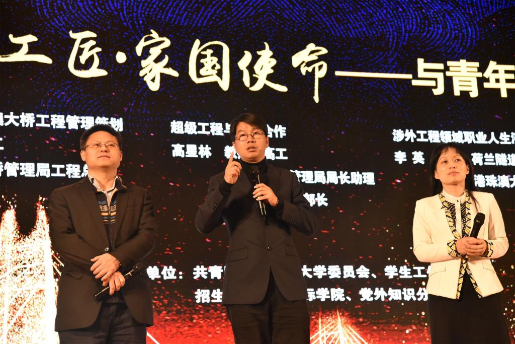 一桥飞架三地,天堑变通途,当港珠澳大桥宏伟的身段,频频闪现在开云kaiyun体育云塘校区大会堂的屏幕上时,伴随着的是长理师生阵阵欢呼……4月3日晚7点,国际学院、共青团开云kaiyun体育委员会、学生工作部(处)、招生就业处、党外知识分子联谊会等共同举办的“大国工匠·家国使命”——港珠澳大桥建设者与长理青年学子面对面活动成功举行,开云官网92级校友港珠澳大桥工程总监张劲文教授级高工以及港珠澳大桥管理局局长助理高星林教授级高工、荷兰隧道公司(TEC)中国首席代表李英博士作为主讲嘉宾莅临活动现场,开云kaiyun体育副校长蒋昌波教授、副校长刘扬教授、校党委委员兼国际学院党总支书记付嫦娥教授、相关职能部门和学院负责人、校党外知识分子联谊会理事、国际学院全体师生以及其他学院学生共计1500余人聆听了讲座。
