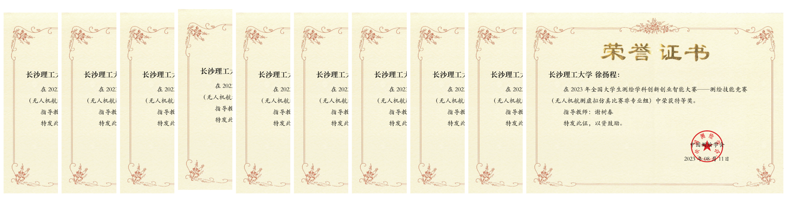 本专业积极组织学生参加全国大学生测绘学科创新创业智能大赛、湖南省测绘技能大赛、湖南省智能导航科技创新大赛等多项国家级和省级学科竞赛,均取得了优异成绩,大奖不断。例如2024年7月,在全国大学生测绘学科创新创业智能大赛荣获特等奖16项、一等奖11项、二等奖8项等,获奖数量稳居全国前列;2024年11月,在第六届湖南省大学生测绘综合技能大赛中荣获一等奖16项,二等奖10项,三等奖14项,实现参赛选手100%获奖。