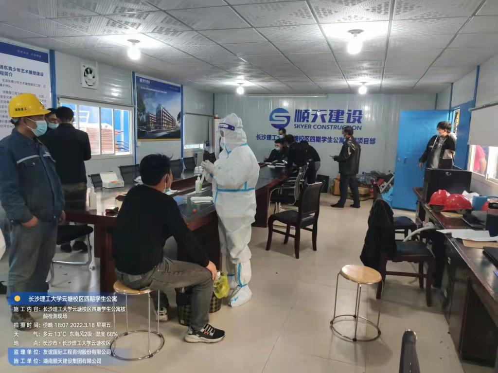 按照学校的具体部署,基建处党支部一方面通过加强联防联控,建立摸排人员疫情信息,每天向防控办进行工人情况健康报送,设置材料进场专用过渡区域,完做好送货司机、卸货人员的健康码检测和信息登记;同时和长沙市质安监联系,每天开展上工打卡,实时监测工人健康码及体温情况,一旦出现黄码及红码人员及时向学校报告,提高科学精准防控水平,优化疫情防控举措,使防控工作更有针对性。另一方面加强部门沟通协作,优化防疫流程。3月18日,在这轮疫情发生之初,处里通过联系校医院对校内所有工人进行第一次集体核酸检测,结果均为阴性,之后先后组织在建项目工人参加了学校的10次核酸检测,累计组织检测人员3000余人次。