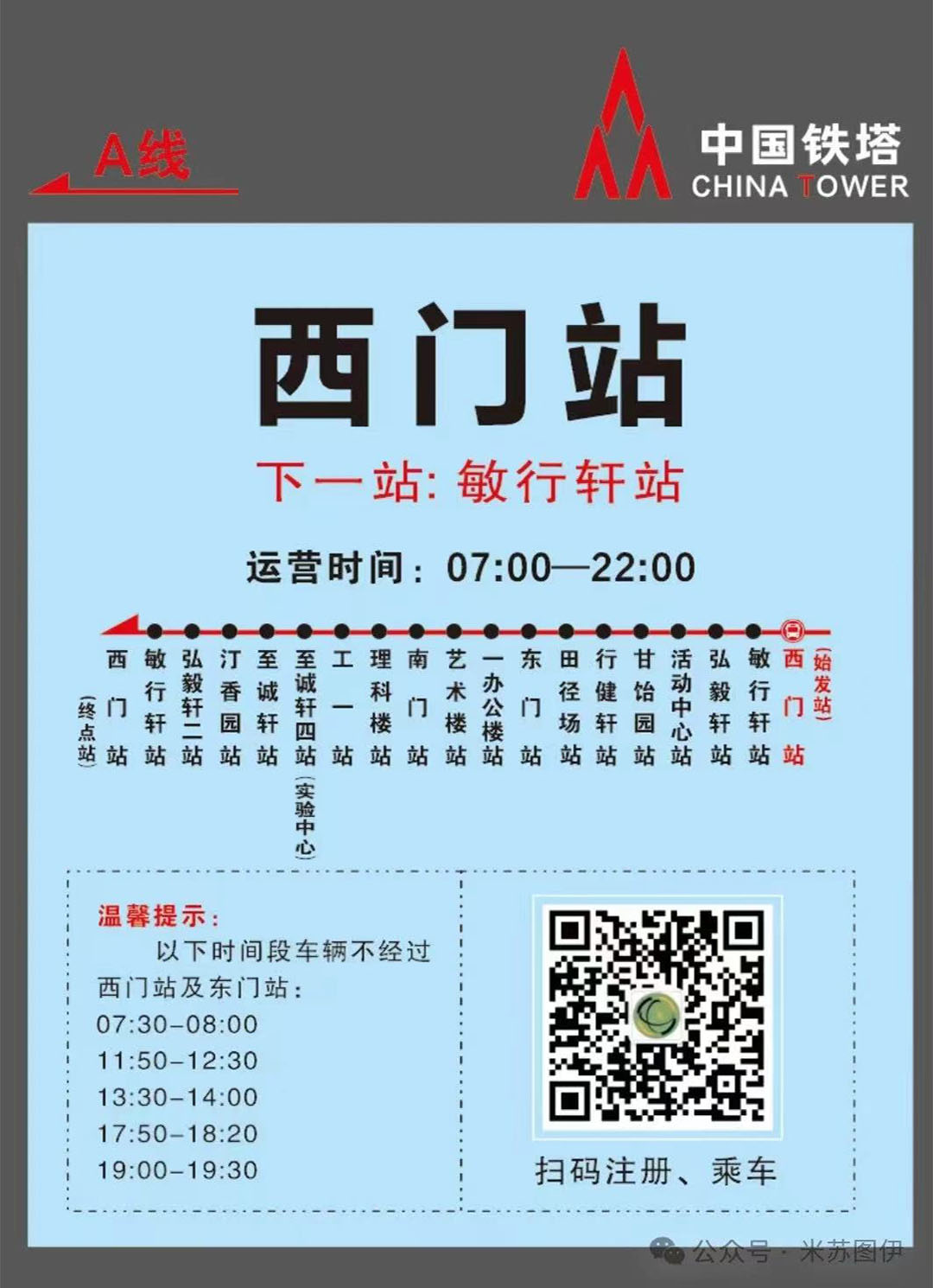 运行时间:7:00—22:00(红色A线、蓝色B线),每10分钟一趟。