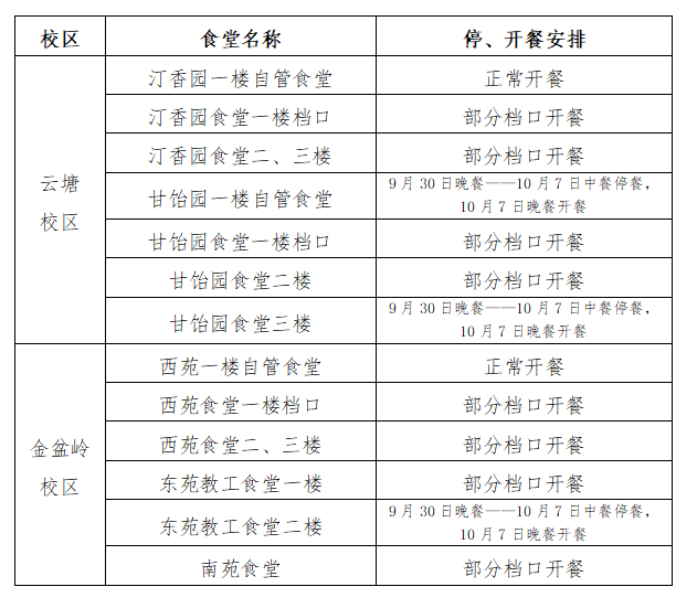 根据学校国庆节放假安排,现将假期各食堂营业安排通知如下: