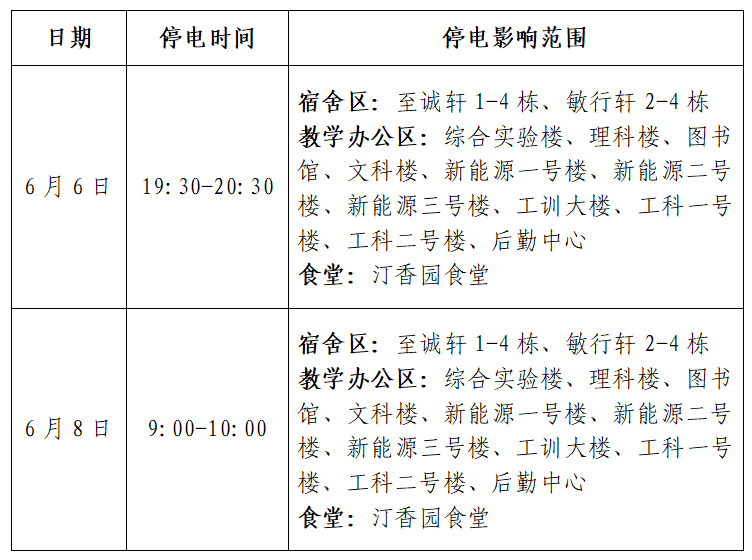 接国网长沙电力公司通知,2025年6月7日,国网长沙电力公司将对云塘校区仙姑岭线停电进行计划检修,届时该线路将会停电。为保障学校的正常运行,我中心将于2025年6月6日、6月8日进行倒闸。具体停电时间及停电影响范围如下: