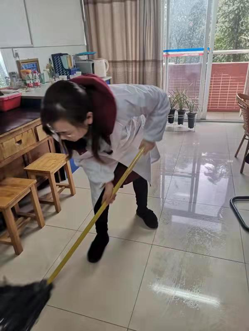 防疫清洁消毒过程中,大家分工合作,严格按照操作规范,不放过一处卫生死角,将各功能室里的地板、窗户、墙壁、走廊、桌椅等进行全方位清洁,随后根据不同的物品,科学合理配制消毒液消毒并组织检查。