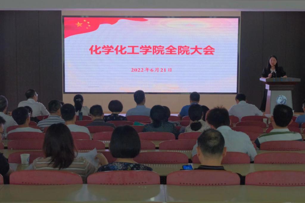 6月21日,化学化工学院在工科三号楼A201会议室召开全院大会,学院党政领导班子和全体教职工参加会议,会议由党委副书记、副院长陶双主持。