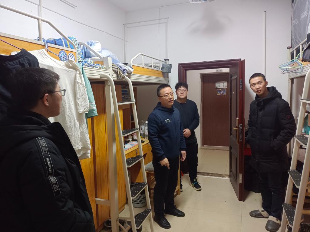 为进一步关心同学们的生活学习状态,增进师生交流互动,筑牢防疫安全线,保障学生安全,了解学生的思想动态。12月4日晚,化学学院党委书记宋刘斌、辅导员王彪走访了学生寝室,与学生们亲切交流,关心疫情期间学生的心理及学习生活状态,回应学生关切的问题。