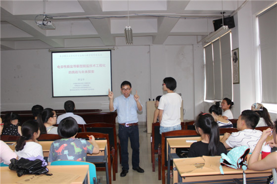 李玉平研究员首先热情地介绍了中科院过程工程研究所的研究方向、成就以及他本人的研究经历,然后就膜在电容性脱盐和正渗透脱盐方面的问题及研究进行了详细的阐述,重点就膜的润湿及避免、膜与其他材料复合研究降低膜阻力等方面进行了生动而有趣的介绍,尤其是分享了研究过程中研究思路的确定和研究方案的不断修正等,吸引了老师们的热切关注和讨论。我院电厂化学专家朱志平教授与李玉平研究员就电厂水处理中用膜除盐等方面的相关问题及解决途径进行了热烈交流。此外,李玉平研究员还特地向同学们介绍了过程工程研究所夏令营等项目,引起了在场同学们的很大兴趣。