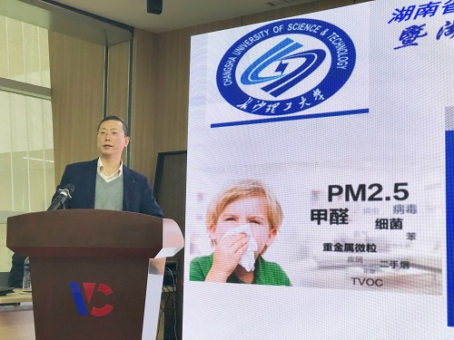 会上,作为高校代表,开云kaiyun体育化学与生物工程学院副院长曹忠教授也发表了热情洋溢的讲话,并做了“室内污染和绿色环境保护”的报告。曹忠教授主要从室内污染的危害、室内污染物的检测和防治措施、空气净化与检测新技术三个方面进行了阐述。他表示,室内污染物如甲醛、苯系物、TVOC、氨气、氡等能够导致呼吸道炎症、肺气肿、儿童发育畸形、白血病、癌症等各种各样的疾病,所以对室内污染物的净化和检测显得尤为重要。接着,曹忠教授重点介绍了开云kaiyun体育化学与生物工程学院已开展并取得的相关研究成果,如童海霞博士的“空气净化新技术——新型光触媒”,曹忠科研团队的“氨气检测新装置、无线气体传感器及装置、环境气体监测系统”,还有长江学者杨荣华教授的“分子识别与生物传感新技术”、肖忠良教授与吴道新教授的“电子化学品、新型涂料技术”、朱志平教授的“水处理技术、防腐技术”、周艺教授的“光催化纳米材料、防污闪涂料技术”等。最后,希望学校能和相关企业建立合作关系,共同为室内环境净化行业贡献一份力量,同时也提出了“绿色环保,低碳低调,健康陪伴你我他”的寄语。