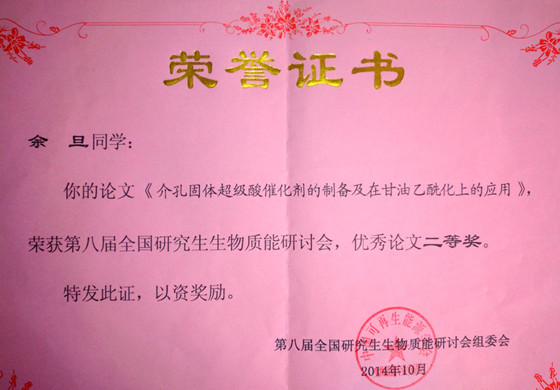我院研究生余旦、安星辰、房文婷,徐艳,贺登辉参加了第八届全国研究生生物质能研讨会,他们提交了5篇论文进行会议交流。期间,我院师生代表与国内知名专家就生物质液体燃料、生物质甘油综合利用等方面进行了广泛交流、探讨和学习。余旦同学的论文《介孔固体超级酸催化剂的制备及在甘油乙酰化上的应用》荣获第八届全国研究生生物质能研讨会优秀论文二等奖。