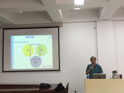 张敬东教授首先介绍自己的工作经历,表达回到自己曾经工作的学校的喜悦之情,然后结合自己近十年来主持的3项国家自然科学基金面上项目和1项国家863重点项目子课题,带领团队利用化学沉积、电沉积等技术制备多种具有高光电催化活性的新型n-n和p-n型异质结膜电极,用于有机污染物降解研究,并探讨利用光电催化同时去除复合污染体系中有机污染物与重金属,以及将酶与光电化学结合用于协同催化降解污染物的节能高效的新型去除方法。同时介绍了光伏安分析与光电分析、DNA光电化学传感器、分子印迹光电化学传感器、适配体光电化学传感器、光激发的自供能电化学传感器等在构建光电化学传感器方面开展的系列开拓性研究,指出了未来的研究发展方向,耐心回答了与会者的提问,获得了师生们的热烈掌声。